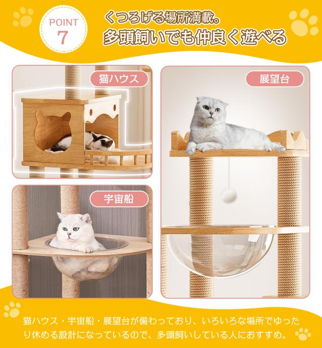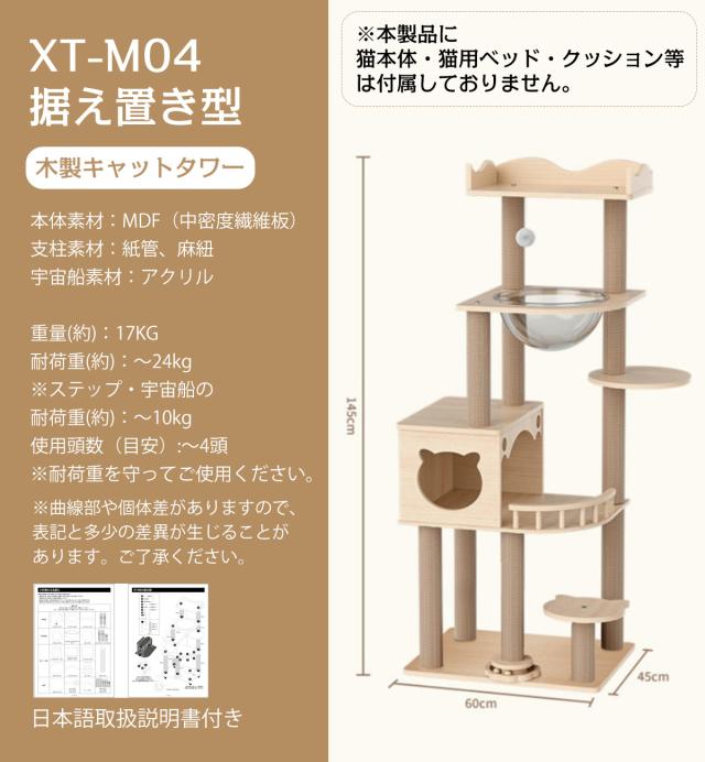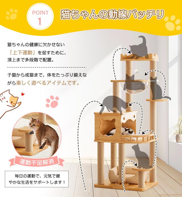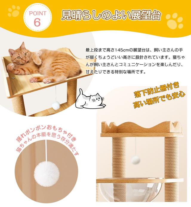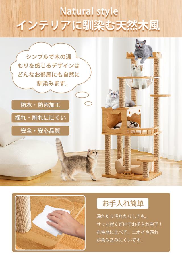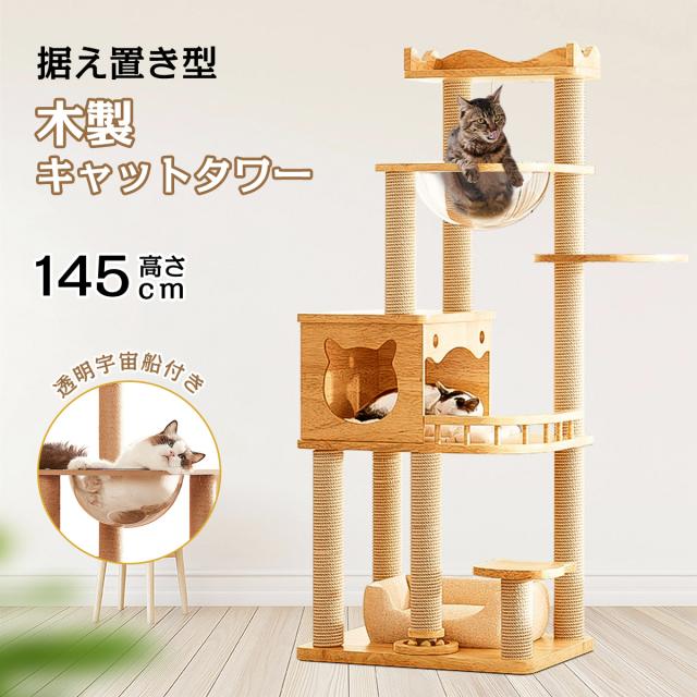 【送料無料】据え置き型 キャットタワー 天然木 高さ145cm 猫タワー 大型猫用 多頭飼い 天然麻紐 爪とぎ キャットツリ 部屋 キャットタワー見晴台 透明宇宙船 おしゃれ インテリア 運動不足解消