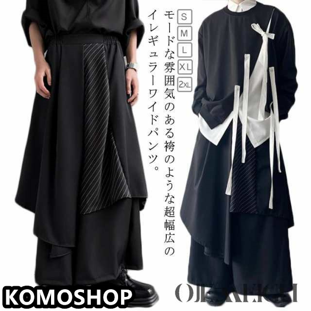 ワイドパンツ メンズ 袴パンツ ロング丈 イレギュラー フレアパンツ スカートパンツ スカート風 ガウチョ ゴムウエスト タック入り 薄手 春 夏 秋 ストリート モード系 v系 はかまパンツ 大きいサイズ レディース ユニセックス 黒 ブラック 【送料無料】