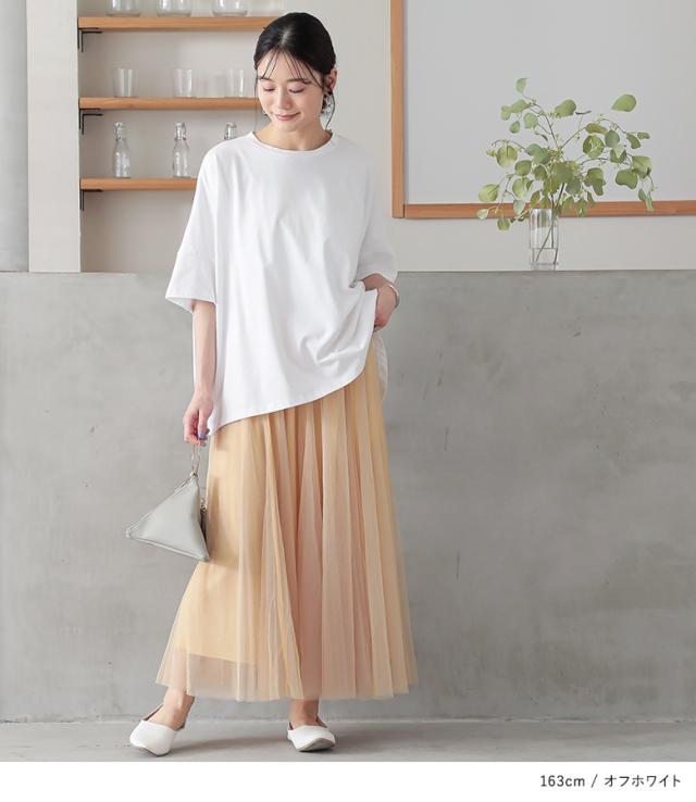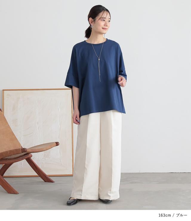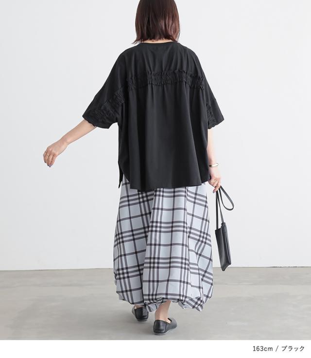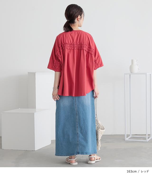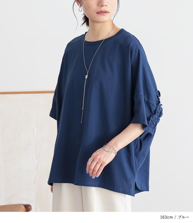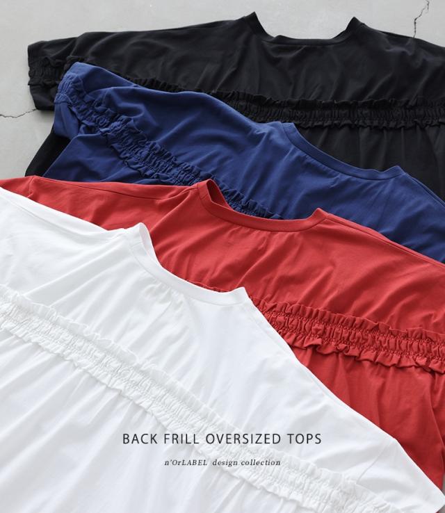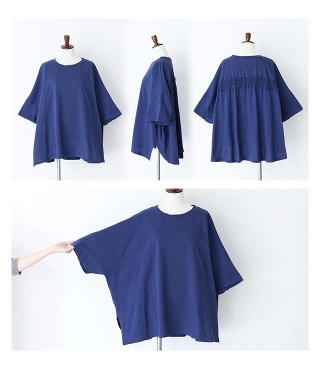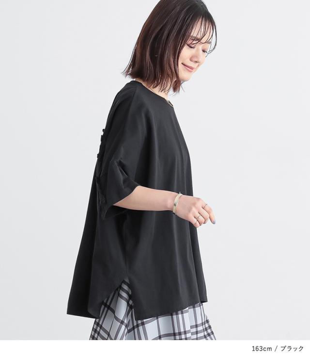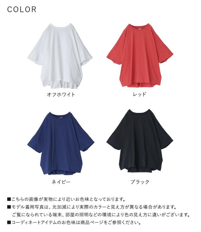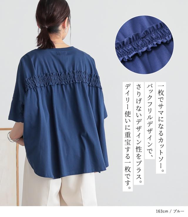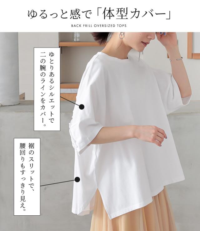 『バックフリルオーバーサイズカットソー』※メール便可※【10】[カットソー レディース トップス 半袖 五分袖 Tシャツ 綿100% フリル 二の腕カバー ゆったり オーバーサイズ 春 夏]
