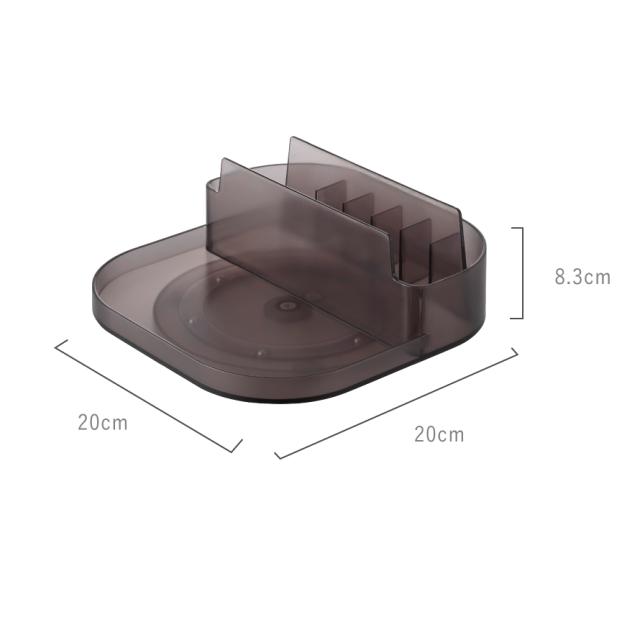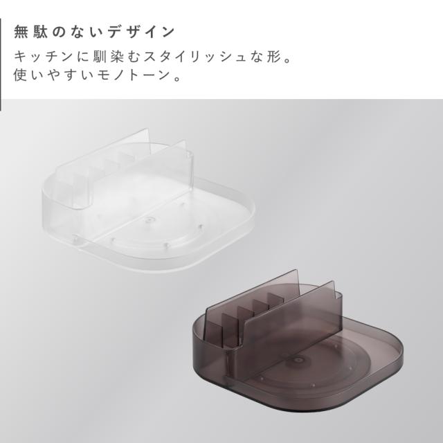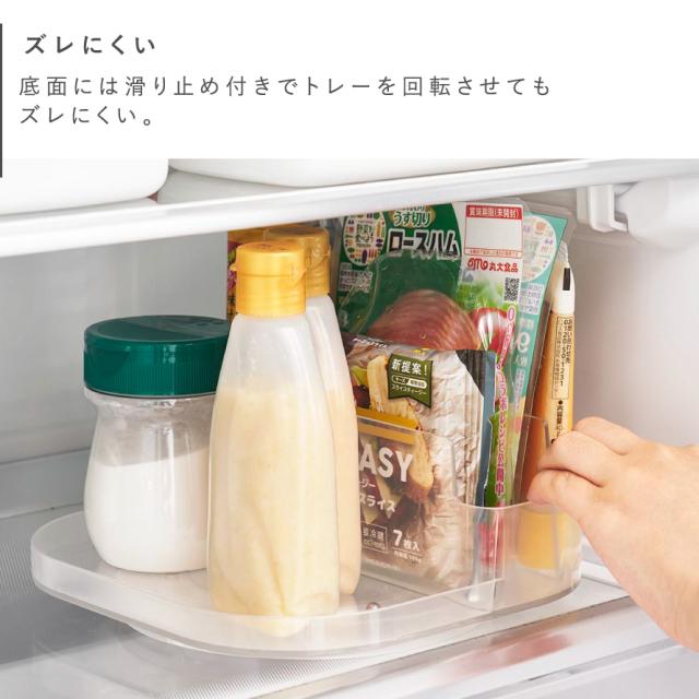 奥の物が取り出しやすく、細々した物も立てて収納できる仕切り付きの回転トレー。奥にある物も回転させることで楽に取り出すことができ、底面には滑り止めがついているのでトレーを回転させてもずれにくく安心です。