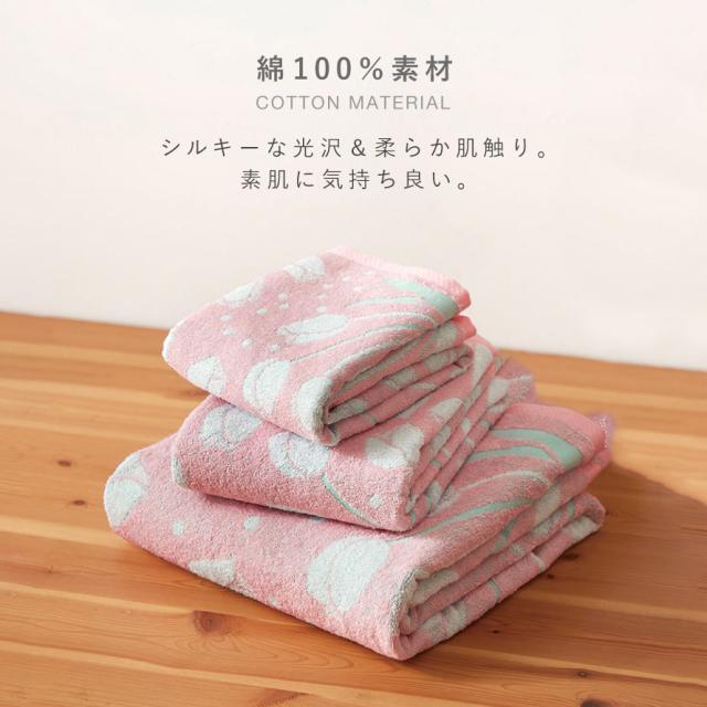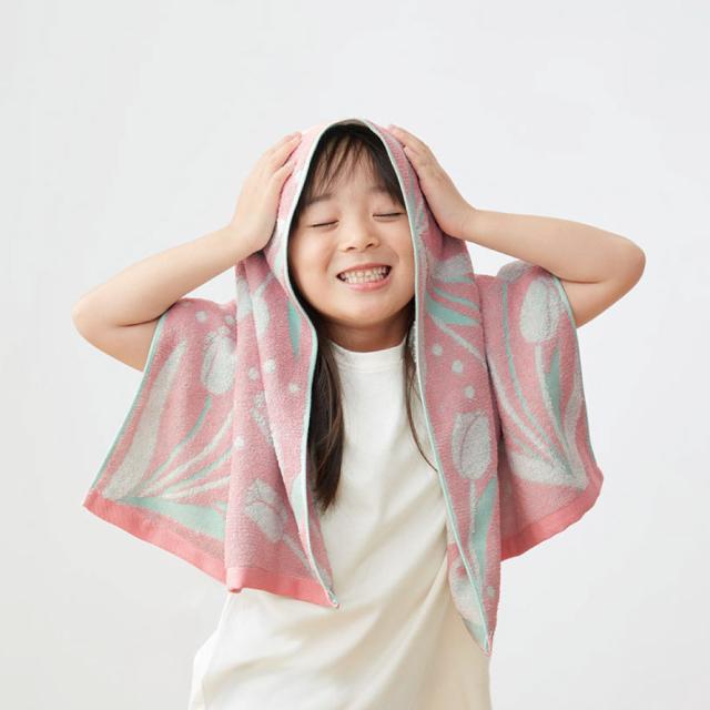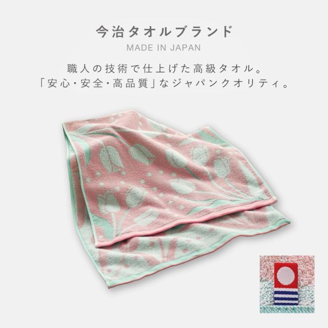 今治ブランドの高級品質、ソフトな触り心地のチューリップ柄タオル。今治タオルは、綿100%の上質な素材を使用し、熟練した職人によって丁寧に織られています。そのため、肌触りがとても心地よく、吸水性も抜群です。