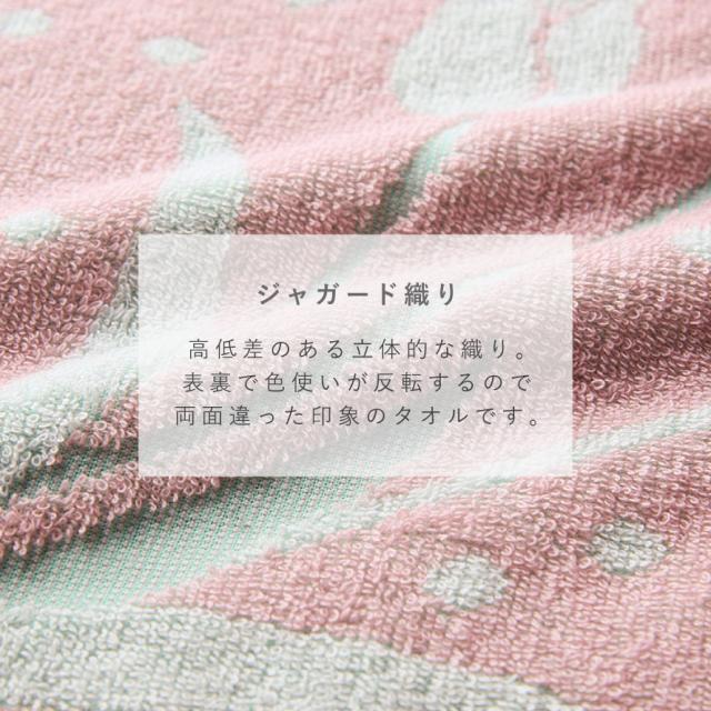 パイル糸に高低差をつけ、絵柄を立体的に表現した「ジャガード織り」。ヘム(短い辺)までパイルにすることで、吸水性と肌あたりのよいタオルに仕上げました。経験豊富なタオル職人が織機で一枚ずつ丁寧に折り上げました。表裏で織り色の出方が反転するので、反対の面はまた違った印象のタオルです。