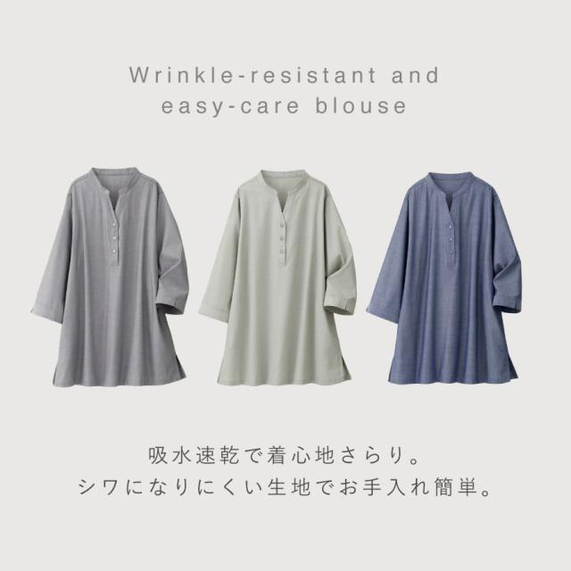 吸水速乾で着心地さらり。シワになりにくい生地でお手入れ簡単のロングブラウス。