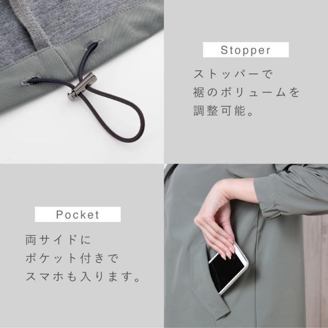 裾ゴムスピンドルとストッパーで裾のボリュームを調整可能。裾をキュッと絞って好みのシルエットにアレンジ。袖口下はゴム仕様で袖まくりがしやすく袖口からの風を防ぎます。