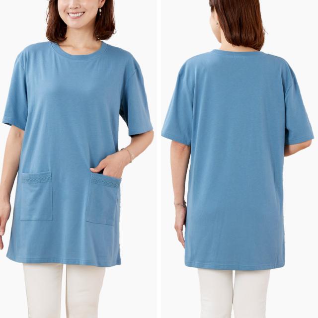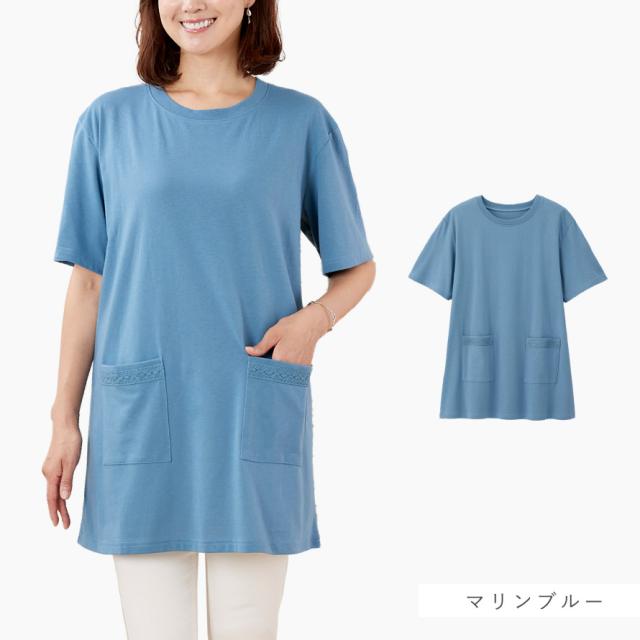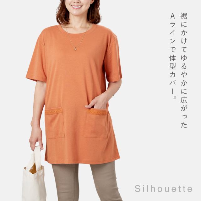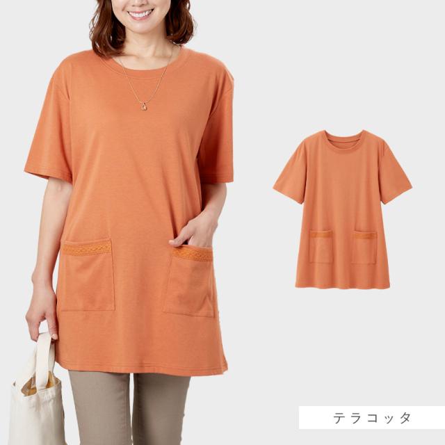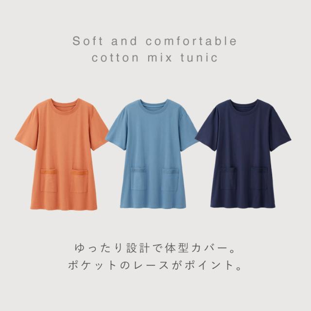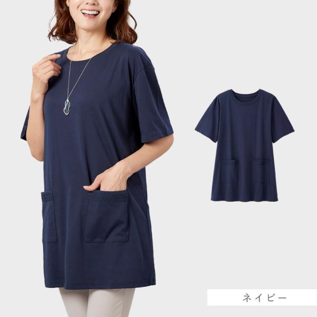 ゆったり設計で体型カバー。ポケットのレースがポイントのチュニック。