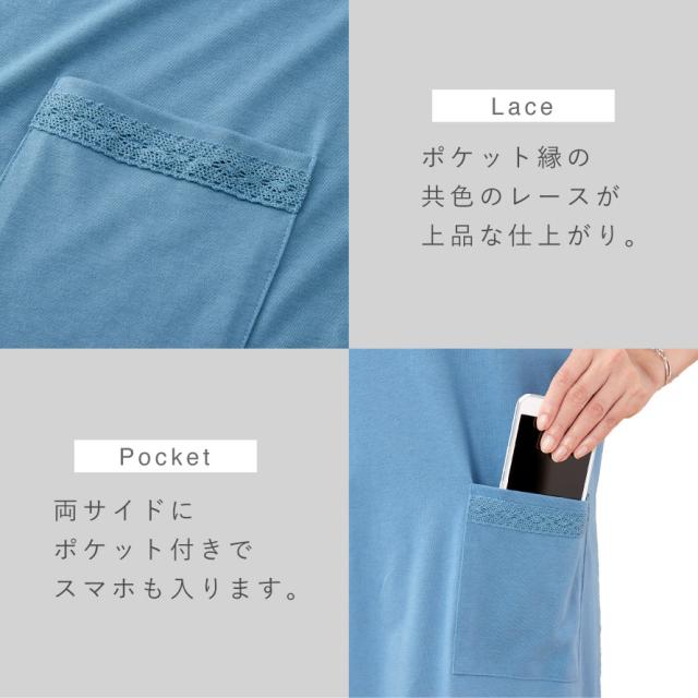 シンプルな無地カラーなのでボトムスを選ばずコーデしやすいデザイン。ポケットには共色のレースをあしらえ上品な仕上がり。