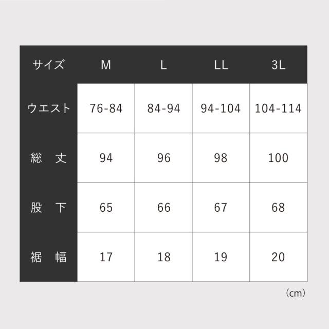 ■サイズ:M/ウエスト76-84、総丈94、股下65、裾幅17、L/ウエスト84-94、総丈96、股下66、裾幅18、LL/ウエスト94-104、総丈98、股下67、裾幅19、3L/ウエスト104-114、総丈100、股下68、裾幅20cm