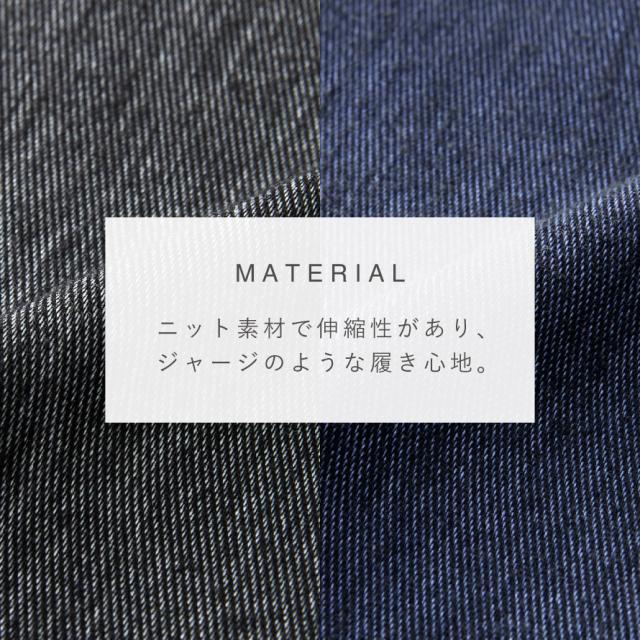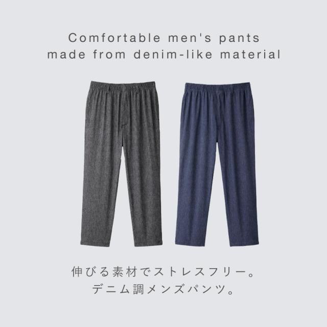 ストレッチ素材でストレスフリー。デニム調メンズパンツ。ニット素材で伸縮性があり、ジャージのような楽ちんな履き心地。デニム調なのでお出かけにも◎。お家でのくつろぎタイムにもおすすめ。