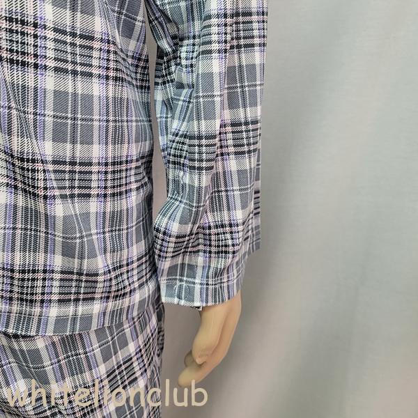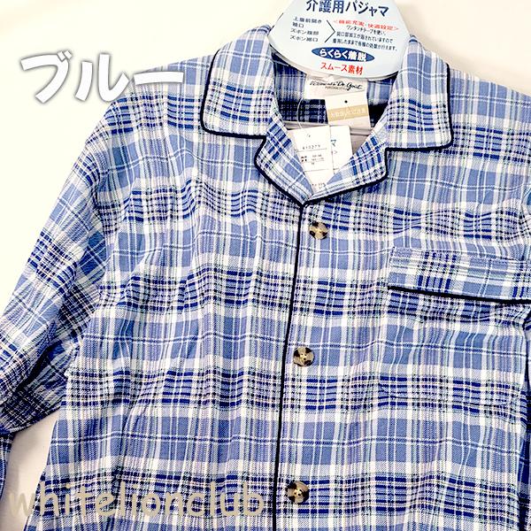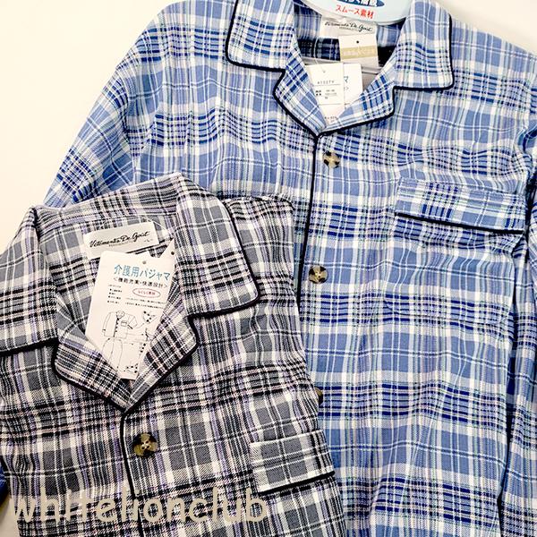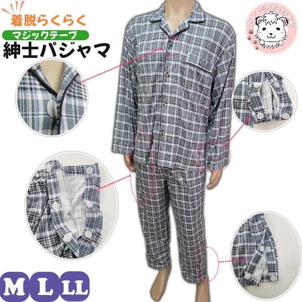 ワンタッチ パジャマ メンズ 長袖 長ズボン パジャマ 前開き 介護パジャマ チェック柄 M/L/LL | マジックテープ のびのび ストレッチ らくらく着脱