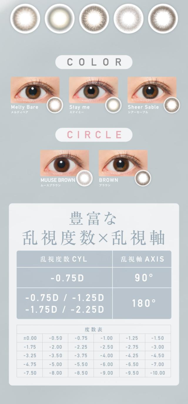 ・乱視度数(CYL):-0.75D/-1.25 D /-1.75 D /-2.25 D ※乱視軸90°は-0.75Dのみ