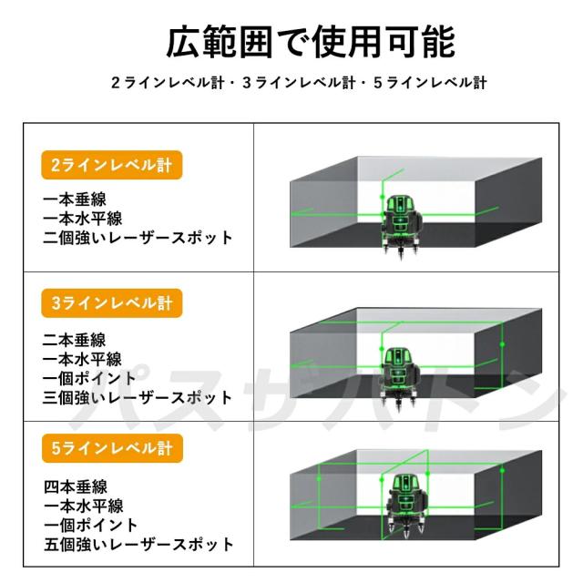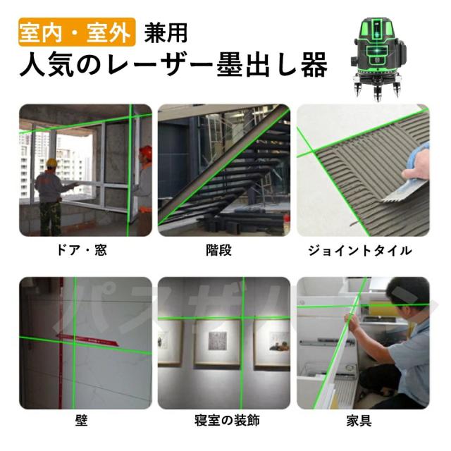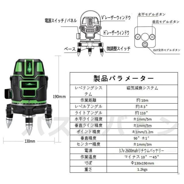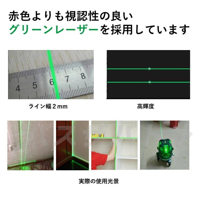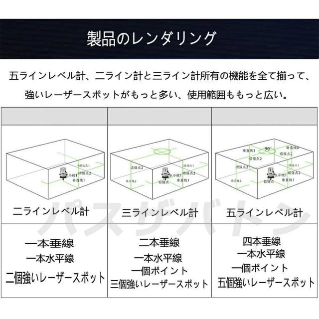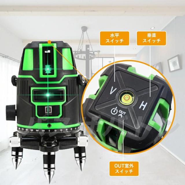 レーザー墨出し器 5ライン グリーンレーザー墨出し器 水平器 レーザーレベル 軽量 防滴 防水 防塵 4方向大矩ライン照射モデル フルライン 高輝度 レーザー 墨出器 墨出し 墨だし器 バッテリー2個 日本語説明書 PSE認証済み 1年保証