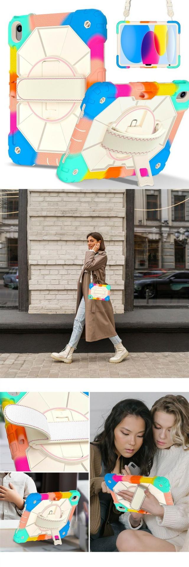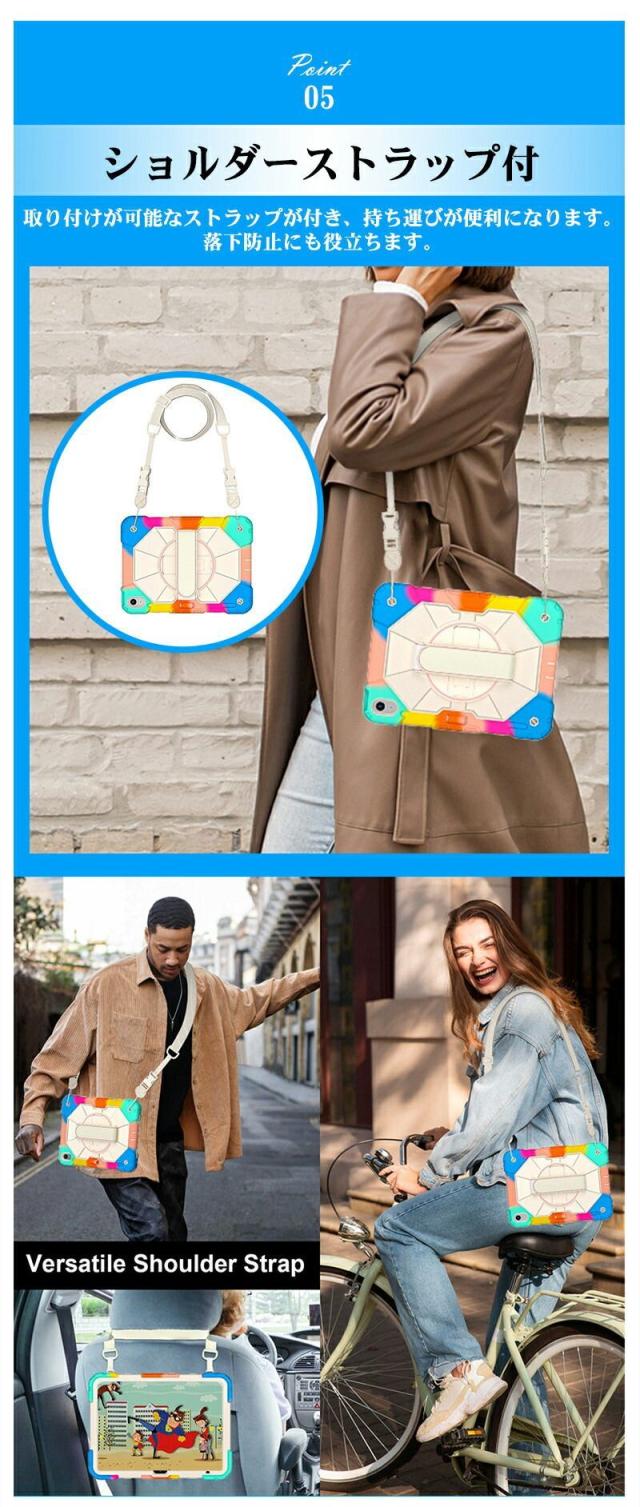 ショルダーベルトで首にかけることでいざという時のiPadの落下を防ぎます。またバックルタイプなのでいつでも着脱が可能です。