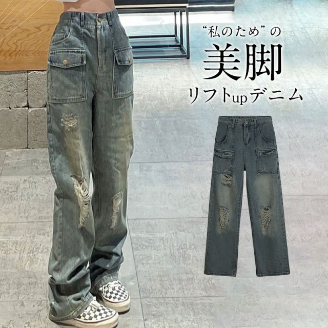 【ポイント5倍!】 デニムパンツ ワイドパンツ レディース ストレッチ カジュアル ジーンズ 伸縮 ユーズド感 ブリーチ ゆったり ストリート おしゃれ ウエスタン