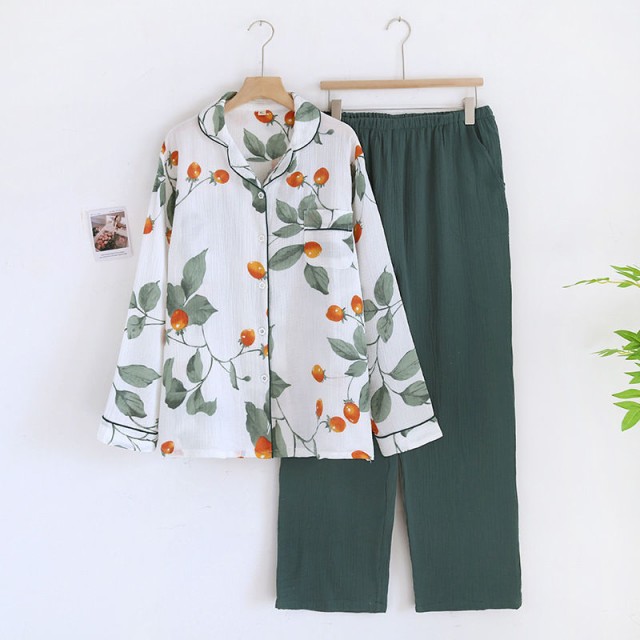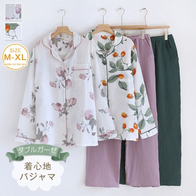 ダブルガーゼ パジャマ ルームウェア レディース 春 秋 長袖 総柄 綿100% 折り襟 前開き 長パンツ 長ズボン 二重ガーゼ コットン100% 上下セット セットアップ 部屋着