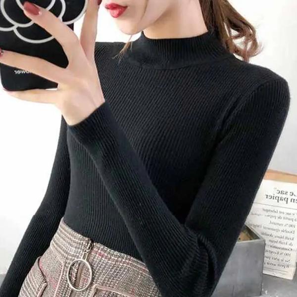 秋冬モックネック女性セーターヴィンテージベーシック固体ニットトップスカジュアルスリムプルオーバー韓国セーターシンプルシックなジャンパー