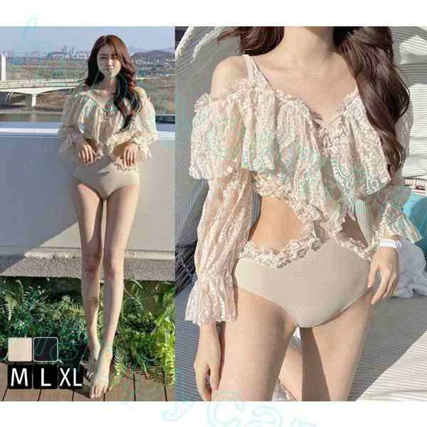 水着 オフショルダー オフショル 水着 レディース レース ワンピース モノキニ 長袖 オフショルワンピ フリル 透け感 パ