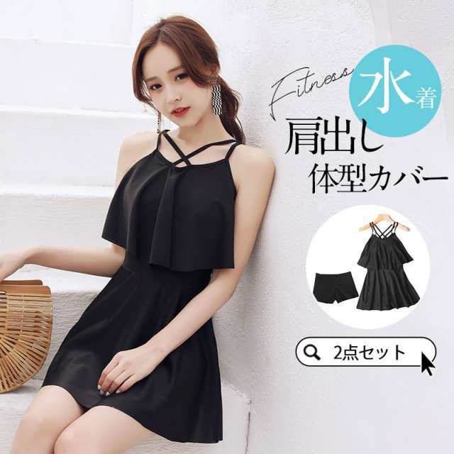 水着 レディース ワンピース 2点セット ショートパンツ オールインワン 体型カバー おしゃれ かわいい 40代 50代 肩出し