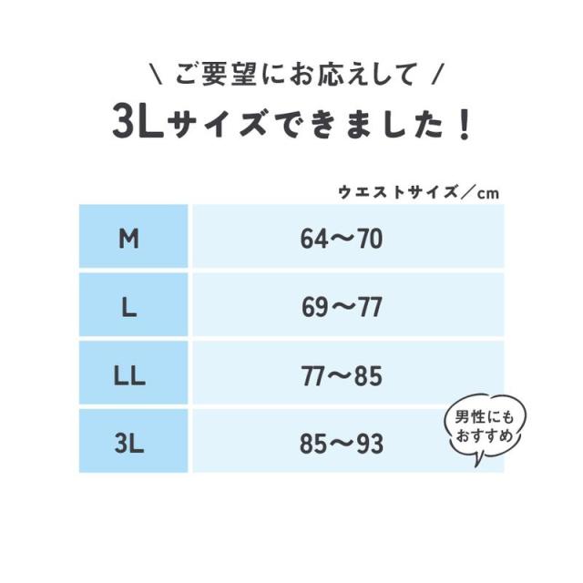 | サイズ | M:ウエスト 64〜70cm / 142g L:ウエスト 69〜77cm / 153g LL:ウエスト 77〜85cm / 163g 3L:ウエスト 85〜93cm / 175g |