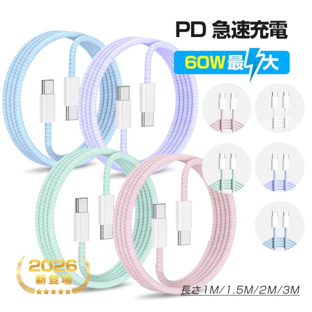 【2026最新】Type-C to Type-Cケーブル 長さ1m/1.5m/2m/3m PD60W 急速充電 iPhone17/16 充電ケーブル 高耐久 ナイロン繊維 5Gbps 高速データ転送 ナイロンメッシュ 20V 3A 超高速 Android/iOS対応 超多用途 iPad充電ケーブル 通勤 収納便利【PL保険加入済み製品・安心】