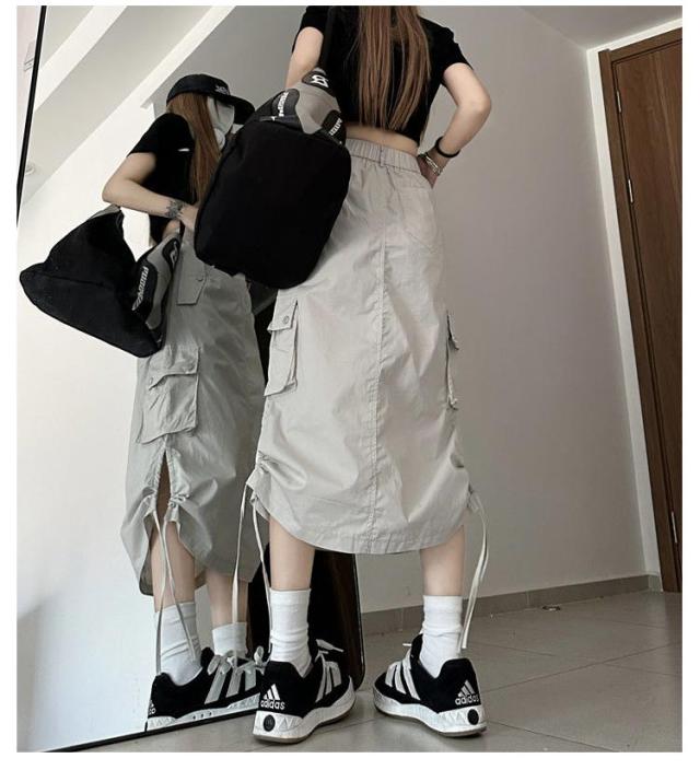 ミリタリー aライン 無地 ロングスカート タイト ドローコード付き レディース ドロスト付き スリット ミリタリースカート カーゴ カーゴスカート 薄手 ゴムウエスト ベイカースカート スカート 春 夏 カーゴスカート シンプル カジュアル ストリート