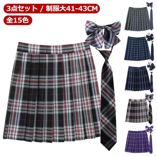 【3点セット】 【送料無料】 【全15色】 制服 スカート プリーツスカート 丈41-43cm スクールスカート チェック スクール 赤 タータンチェック スカート リボン ネクタイ ボウタイ リボンタイ 制服 セット 中学校 中学生 女子高校
