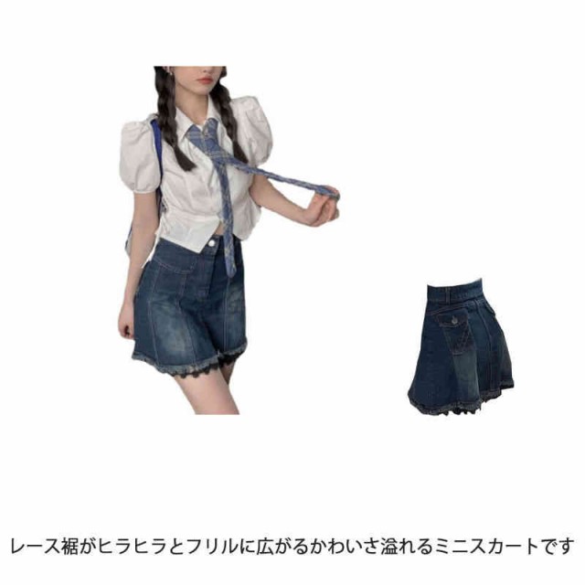 送料無料 デニム フレアスカート ミニ フリル 切替 レース裾 ポケット付き ファスナータイプ レディース プリーツ ボトムス ハイウエスト ボタン付き ダブルボタン かわいい 可愛い カワイイ 春 夏 30代 20代 10代