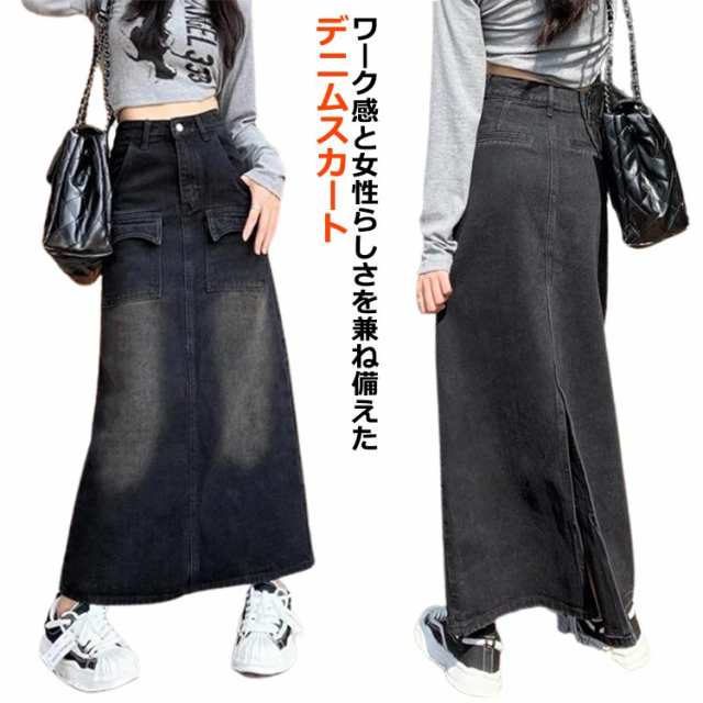 デニム ロング カーゴ レディース ミリタリー ロングスカート デニムスカート 春 スカート aライン デニム タイト スリット タイトスカート カーゴスカート マキシ丈 ミリタリースカート 無地 シンプル カジュアル ストリート 韓国 黒 ブラック