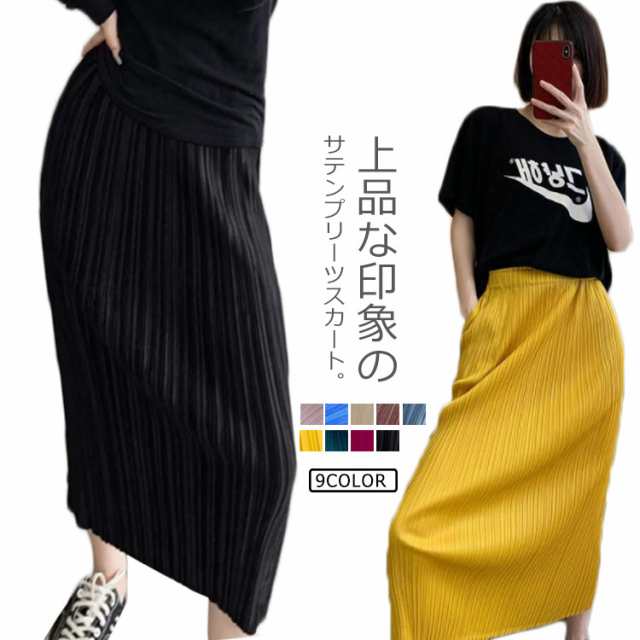 【送料無料】プリーツスカート サテン ロング丈 レディース ナロースカート サイドスリット スカート 裏地付き ゴムウエスト ストレッチ カジュアル Iライン 韓国風 通勤 黒 大きいサイズ ブラック 茶色 ピンク