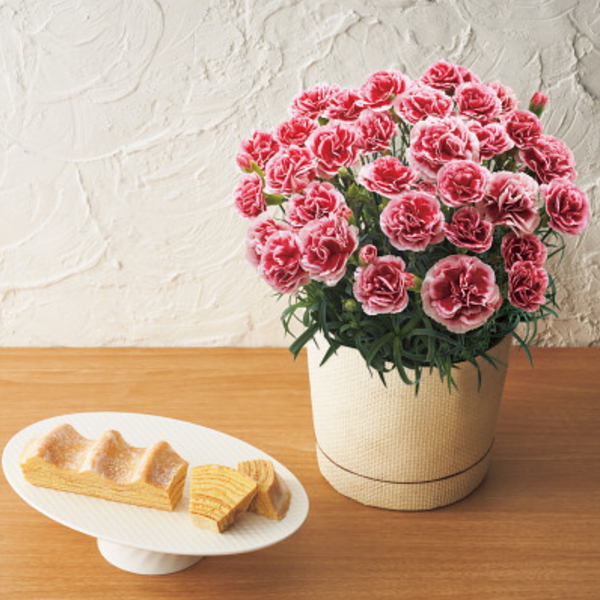 レースのような縁取りがとても可愛らしく華やかなカーネーションと外は香ばしく、中はしっとり、フランスパンのような食べ心地が魅力のバームクーヘンのセットです。