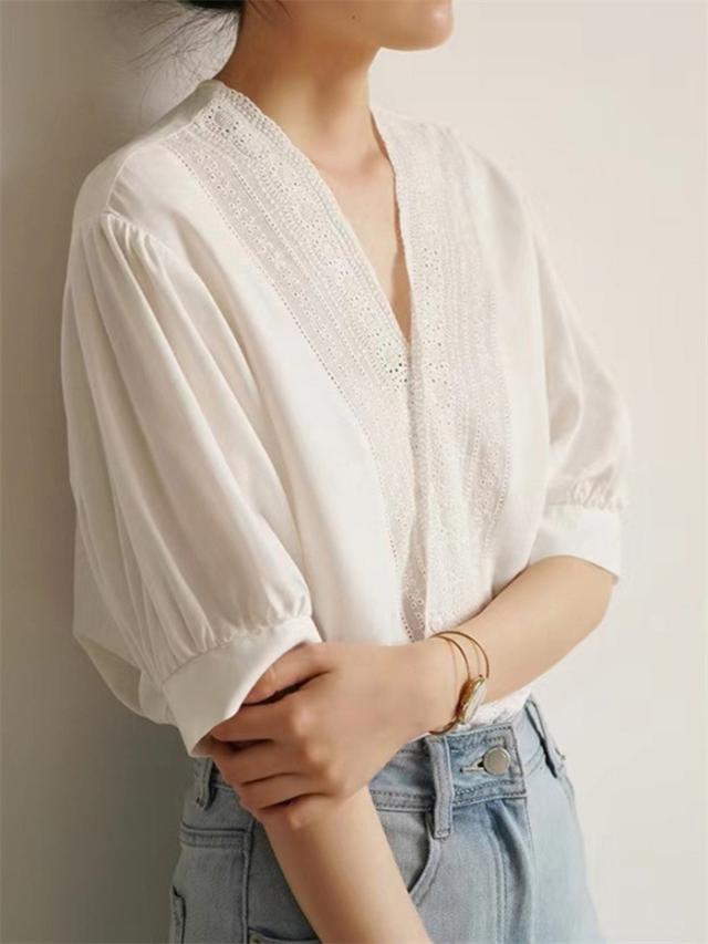 レースブラウス レディース シャツ ゆったり vネック カジュアル 前ボタン 女の子 入学式 ポワント半袖 春 夏 おしゃれ 上品 きれいめ 無地 シンプル フェミニン ガーリー 通勤 通学 スーツインナー デート 女子会