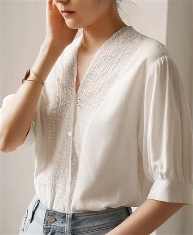 レースブラウス レディース シャツ ゆったり vネック カジュアル 前ボタン 女の子 入学式 ポワント半袖 春 夏 おしゃれ 上品 きれいめ 無地 シンプル フェミニン ガーリー 通勤 通学 スーツインナー デート 女子会 dy034x1x1m5