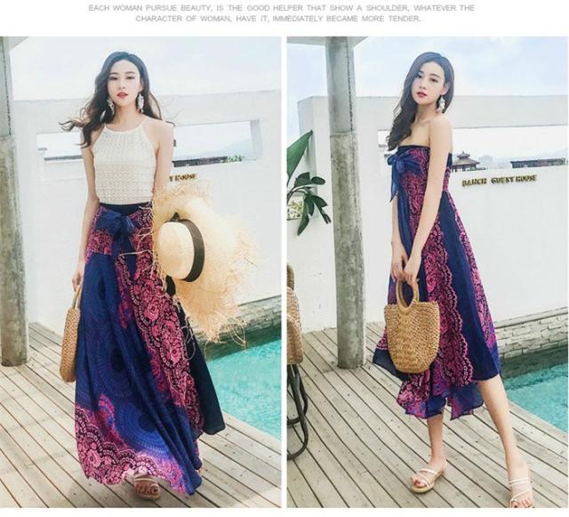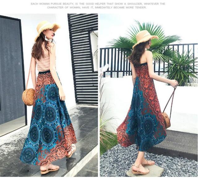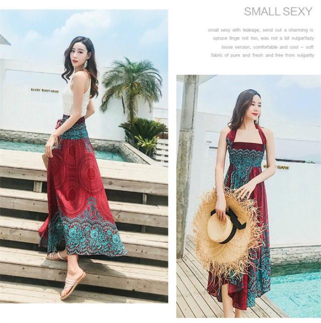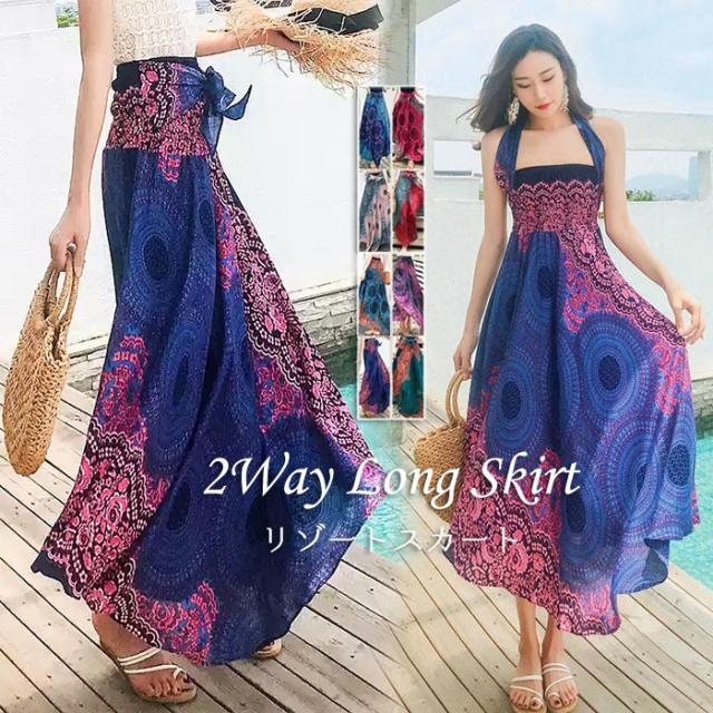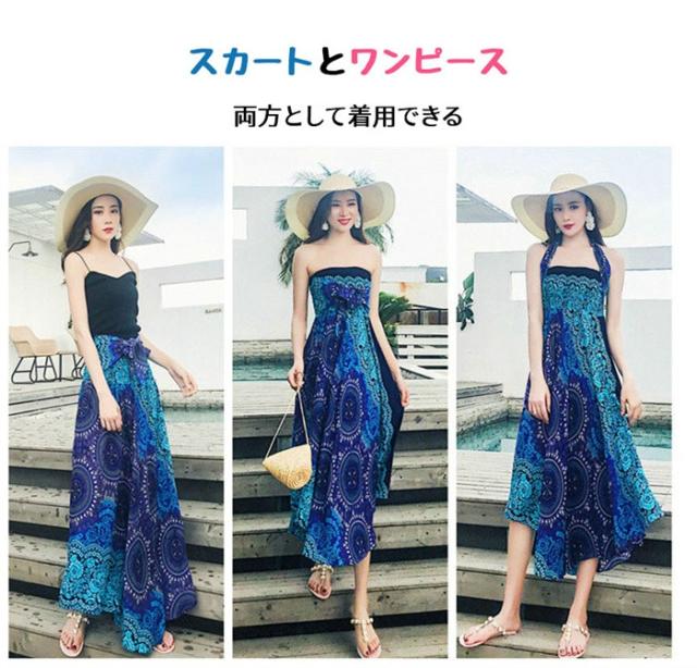 リゾート ワンピース 夏 レディース 海 ワンピース ロングスカート リゾートスカート コンバーチブルスカート 2ウェイスカートワンピース エスニック柄ワンピース ビーチ オーバルドレス 海 サマー マキシ丈 タイ風 フリーサイズ