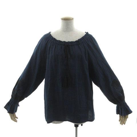 【中古】ドゥクラッセ DoCLASSE ブラウス ドロストネック リボン タッセル 刺繍 キャンディースリーブ リネン 紺 黒 9