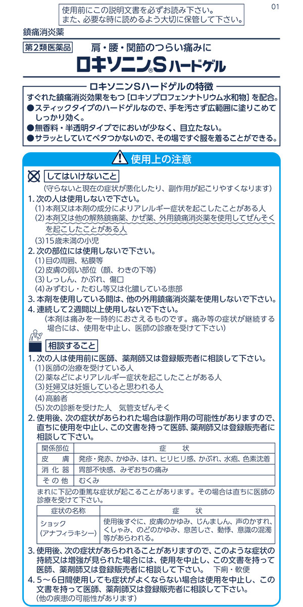 ■してはいけないこと (守らないと現在の症状が悪化したり、副作用が起こりやすくなります) 1.次の人は使用しないで下さい。 (1)本剤又は本剤の成分によりアレルギー症状を起こしたことがある人 (2)本剤又は他の解熱鎮痛薬、かぜ薬、外用鎮痛消炎薬を使用してぜんそくを起こしたことがある人 (3)15歳未満の小児 2.次の部位には使用しないで下さい。 (1)目の周囲、粘膜等 (2)皮膚の弱い部位(顔、わきの下等) (3)しっしん、かぶれ、傷口 (4)みずむし・たむし等又は化膿している患部 3.本剤を使用している間は、他の外用鎮痛消炎薬を使用しないで下さい。 4.連続して2週間以上使用しないで下さい。 (本剤は痛みを一時的におさえるものです。痛み等の症状が継続する場合には、使用を中止し、医師の診療を受けて下さい) ■相談すること 1.次の人は使用前に医師、薬剤師又は登録販売者に相談して下さい。 (1)医師の治療を受けている人 (2)薬などによりアレルギー症状を起こしたことがある人 (3)妊婦又は妊娠していると思われる人 (4)高齢者 (5)次の診断を受けた人 気管支ぜんそく 2.使用後、次の症状があらわれた場合は副作用の可能性がありますので、直ちに使用を中止し、この文書を持って医師、薬剤師又は登録販売者に相談して下さい。 [関係部位:症状] 皮膚:発疹・発赤、かゆみ、はれ、ヒリヒリ感、かぶれ、水疱、色素沈着 消化器:胃部不快感、みぞおちの痛み その他:むくみ まれに次の重篤な症状が起こることがあります。その場合は直ちに医師の診療を受けて下さい。 [症状の名称:症状] ショック(アナフィラキシー):使用後すぐに、皮膚のかゆみ、じんましん、声のかすれ、くしゃみ、のどのかゆみ、息苦しさ、動悸、意識の混濁等があらわれる。 3.使用後、次の症状があらわれることがありますので、このような症状の持続又は増強が見られた場合には、使用を中止し、この文書を持って医師、薬剤師又は登録販売者に相談して下さい。 下痢・軟便 4.5〜6日間使用しても症状がよくならない場合は使用を中止し、この文書を持って医師、薬剤師又は登録販売者に相談して下さい。 (他の疾患の可能性があります)