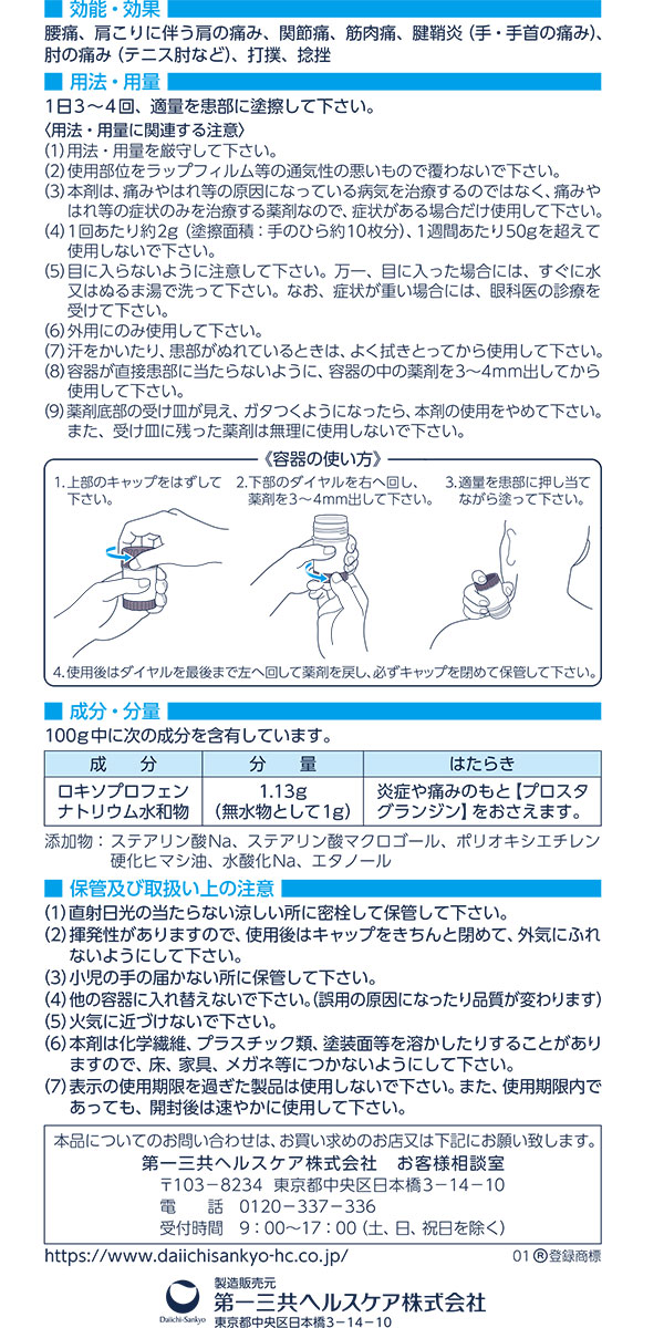 会社名:第一三共ヘルスケア株式会社 住所:〒103-8234 東京都中央区日本橋3-14-10 問い合わせ先:お客様相談室 電話:0120-337-336 受付時間:9:00〜17:00(土、日、祝日を除く) その他:www.daiichisankyo-hc.co.jp/