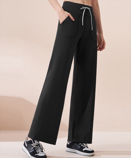 レディース フィットネスハイウエストリボンヨガワイドパンツ
