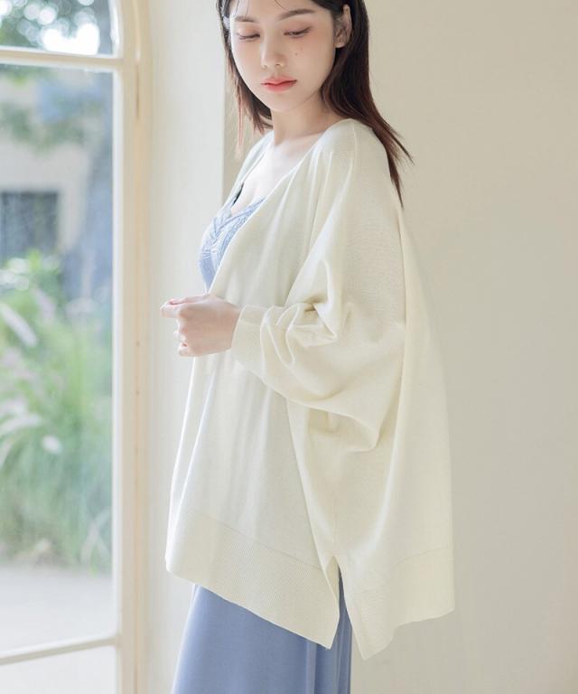 Vネックのデザインがデコルテをすっきりと魅せ、どんなインナーとも好相性。