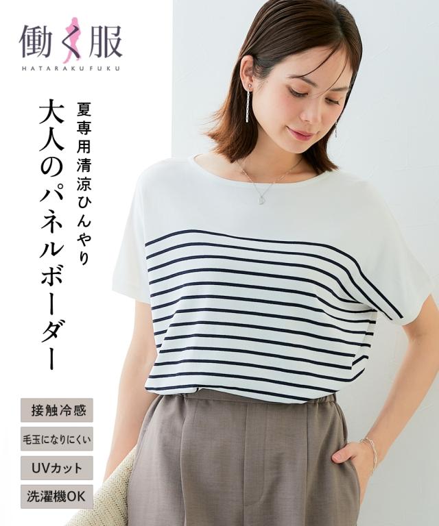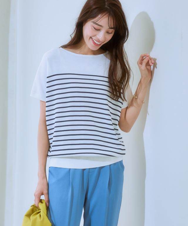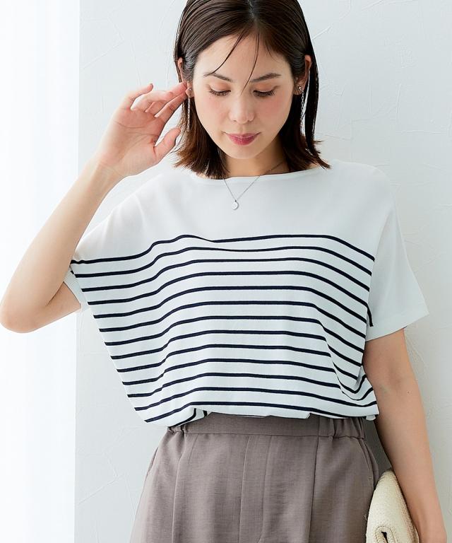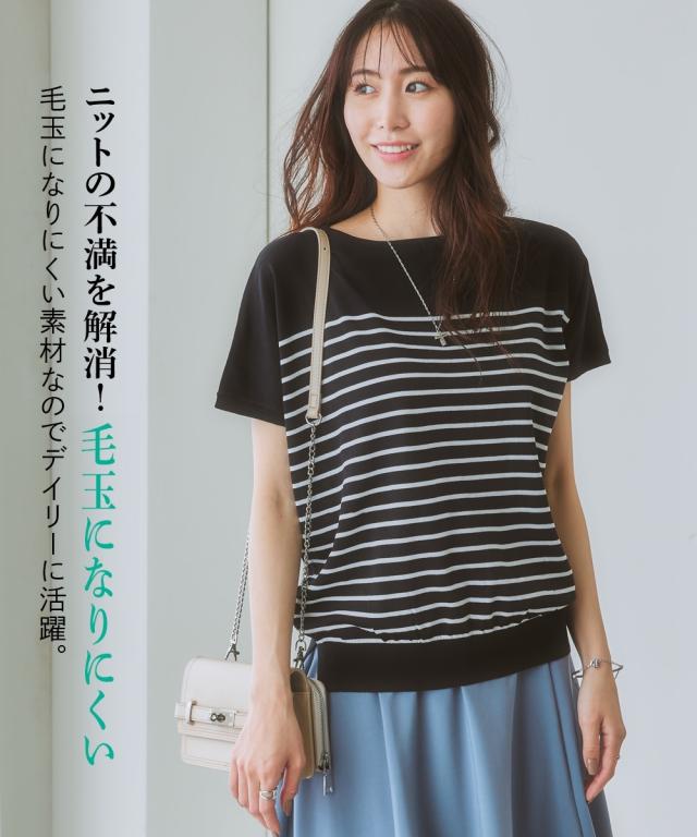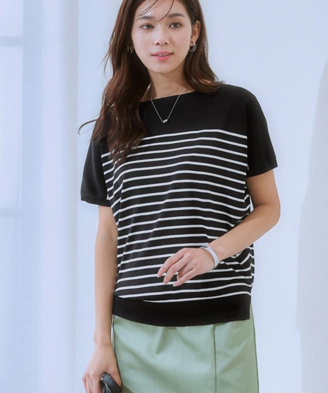 【ひんやり接触冷感】パネルボーダーボートネックニット(UVカット・毛玉になりにくい) 大きいサイズ有