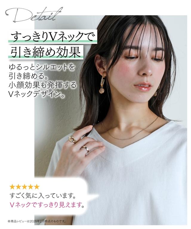オーバーサイズでもデコルテがきれいに見える絶妙な開きのVネックと、ドロップショルダーで女性らしい印象に。