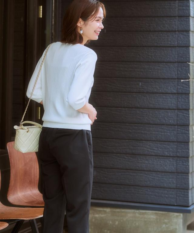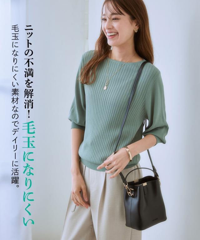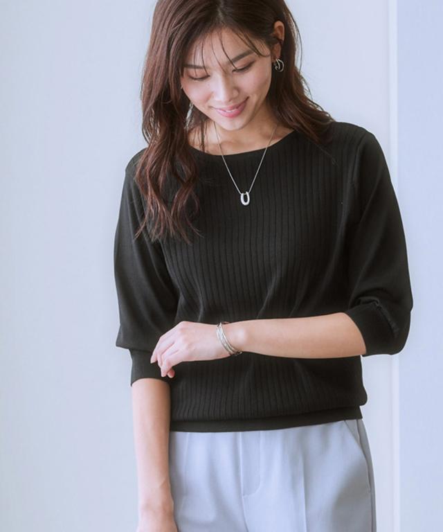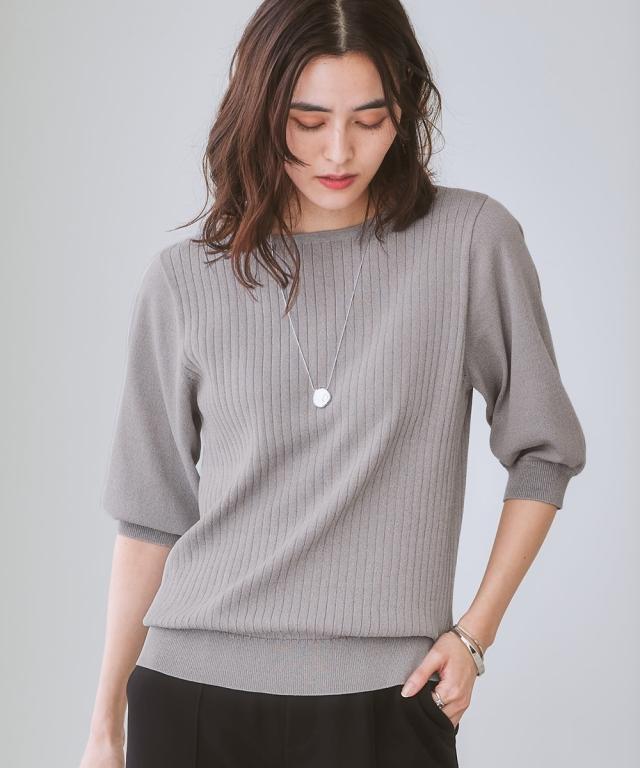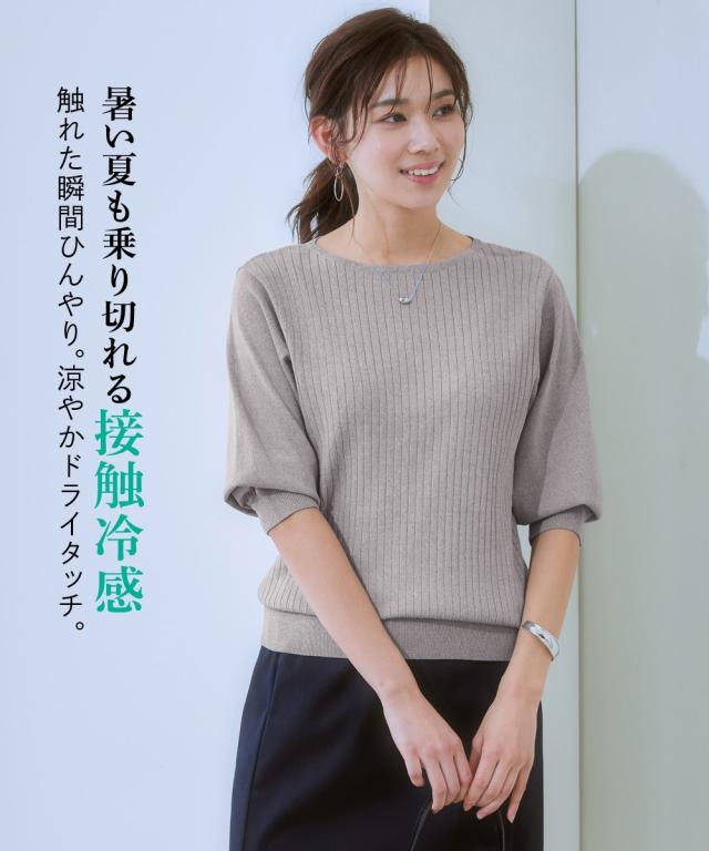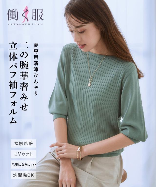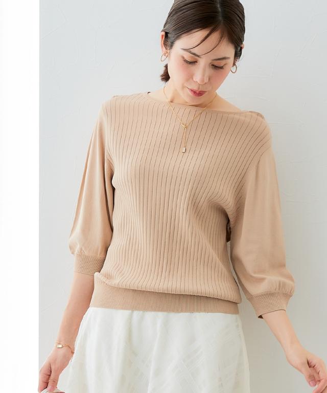 【ひんやり接触冷感】パフ袖ボートネックリブニット(UVカット・毛玉になりにくい) 大きいサイズ有
