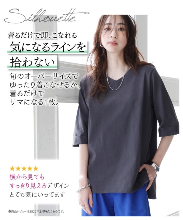 オーバーサイズでもデコルテがきれいに見える絶妙な開きのVネックと、ドロップショルダーで女性らしい印象に。