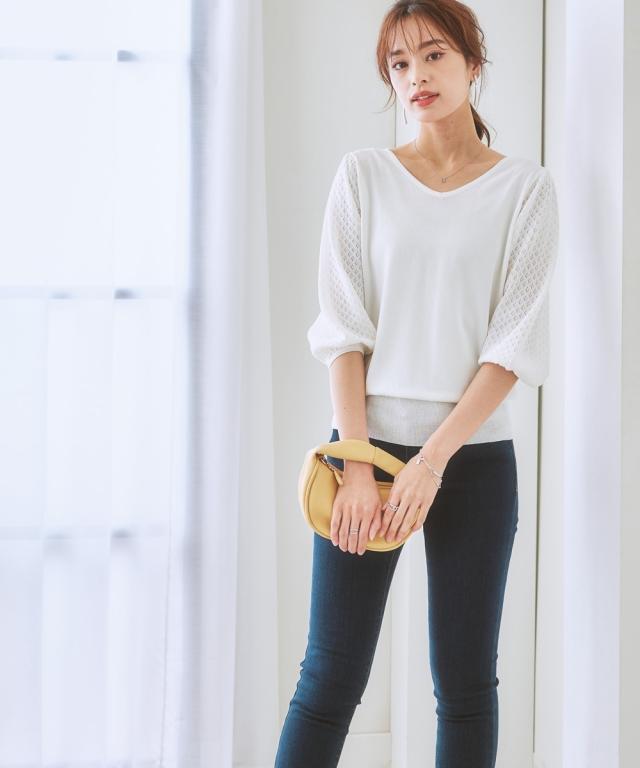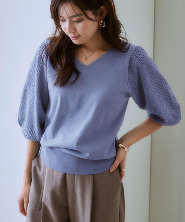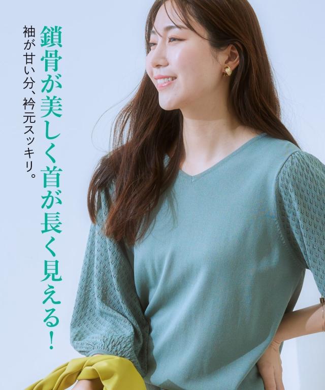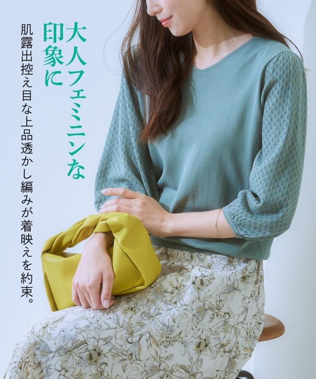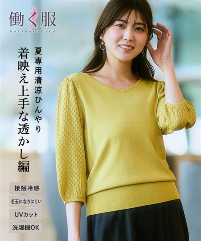 【ひんやり接触冷感】透かし編みパフ袖ニット(UVカット・毛玉になりにくい) 大きいサイズ有