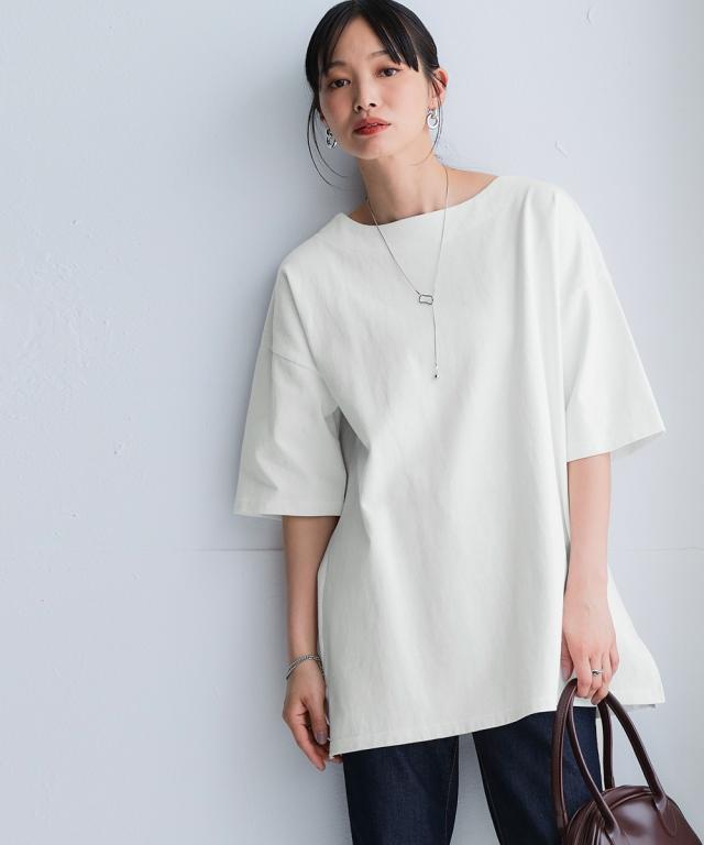 オーバーサイズでもデコルテがきれいに見える絶妙な開きのラウンドネックと、ドロップショルダーで女性らしい印象に。