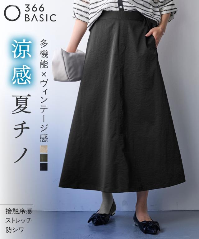 夏の快適ライトチノロングスカート。 接触冷感・ストレッチ・シワが付きにくいの多機能素材という優れもの ■デザイン シンプルデザインで、すっきり見えるロングフレアシルエット。 ウエストは、後ろゴム入りで前はすっきり履きこなしながら、着脱もらくちんなストレスフリーな履き心地。 前後に便利なポケット付き。 ■素材 生地の表面の細かいシボ感と、柔らかな光沢が独特の風合いが上品見えします。 さらりとした肌触りに、接触冷感・ストレッチ性・シワが付きにくいの多機能素材。 お洗濯後のシワも目立ちにくく、履き心地もお手入れも快適な万能素材です。 シワにもなり難く、お手入れも楽なので、旅行時などの長時間着用でも気にせずに過ごせるのも魅力です。 ■おすすめのスタイリング Tシャツ合わせのラフな着こなしのほか、きれいめなブラウスやシャツと合わせた大人のカジュアルなコーディネートを楽しめます。