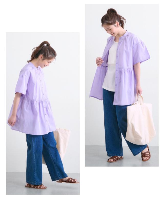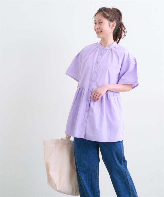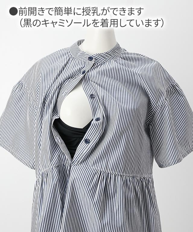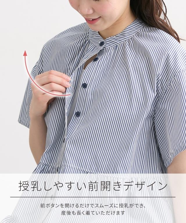 ふんわりギャザーがかわいい、前開きの半袖シャツブラウスです。 ■design ・ふんわりしたシルエットで、お腹や腰回りもカバーしてくれる丈感 ・長めの袖丈で二の腕もカバーします。 ・前を開けて羽織としてもコーディネートできます。 ■point ・前ボタンをあけて授乳ができます。特別な授乳口がないので、マタニティや卒乳後も普通のワンピースとして長く着られます ■fabric ・薄手の織物生地でさらっと軽い着心地