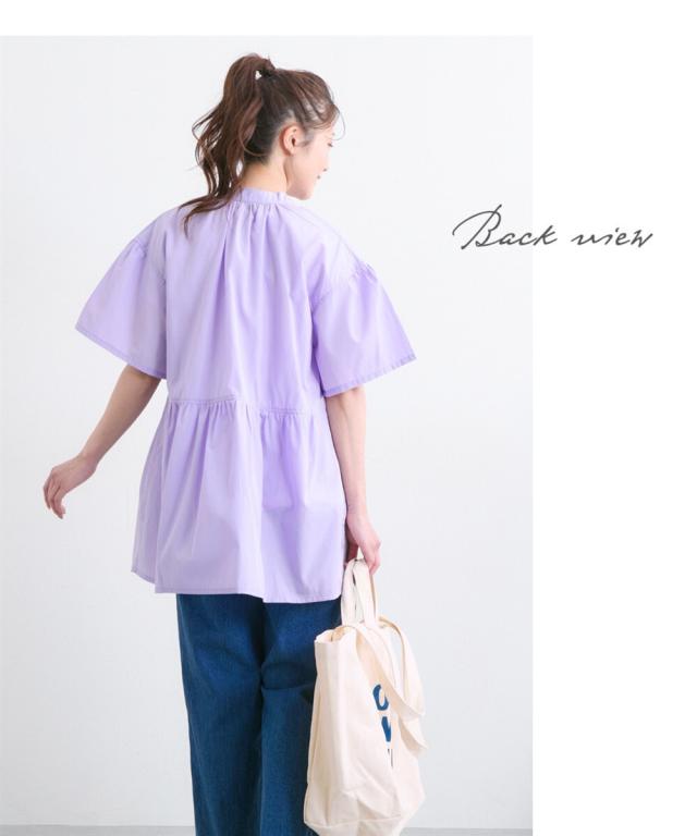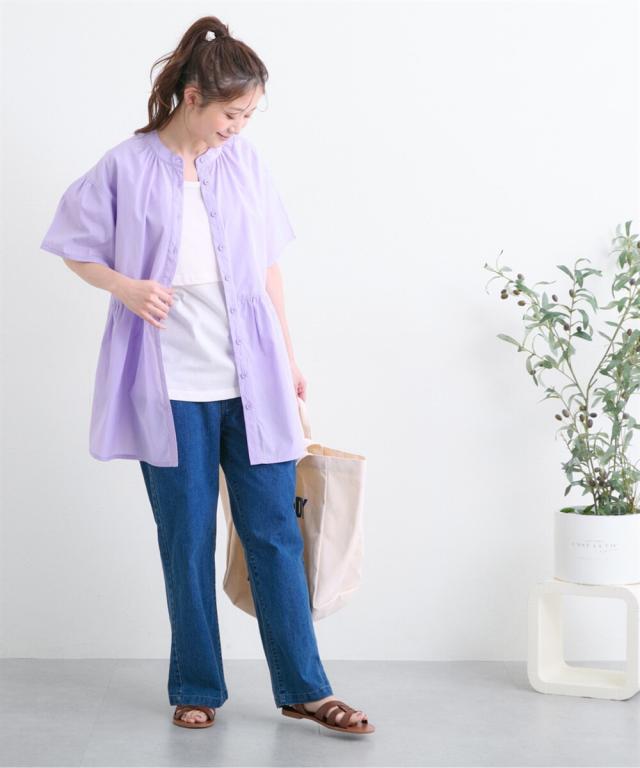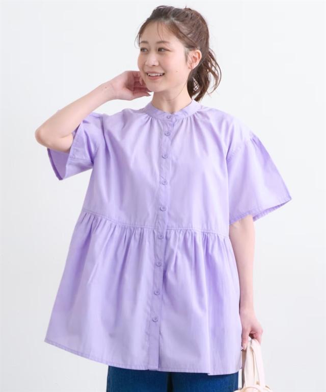 ふんわりギャザーがかわいい、前開きの半袖シャツブラウスです。 ■design ・ふんわりしたシルエットで、お腹や腰回りもカバーしてくれる丈感 ・長めの袖丈で二の腕もカバーします。 ・前を開けて羽織としてもコーディネートできます。 ■point ・前ボタンをあけて授乳ができます。特別な授乳口がないので、マタニティや卒乳後も普通のワンピースとして長く着られます ■fabric ・薄手の織物生地でさらっと軽い着心地