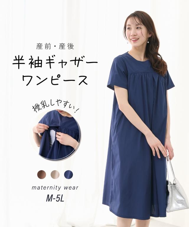 【マタニティウェア・授乳服】センタースリット授乳 半袖ギャザーワンピース(産前・産後)