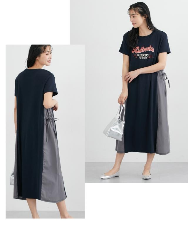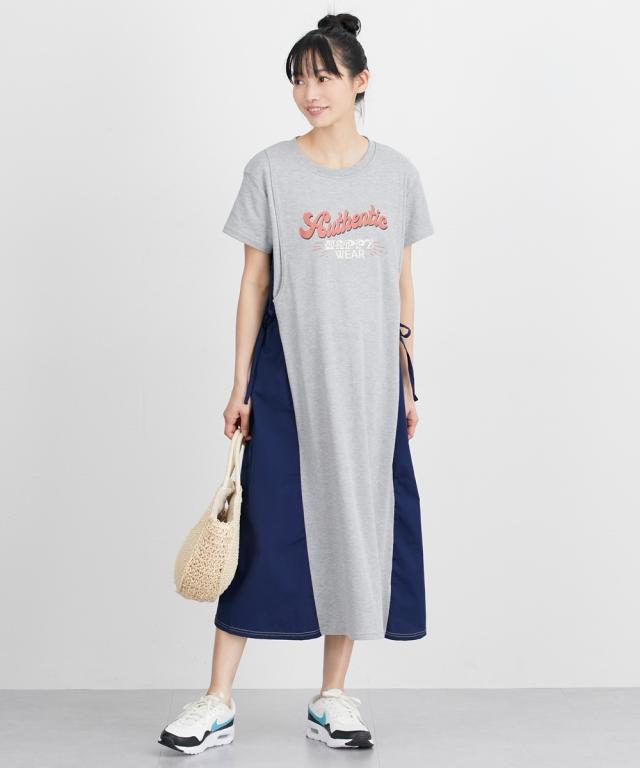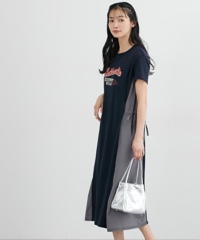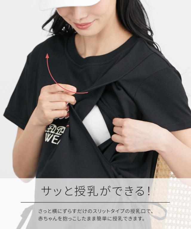 サイドの切替デザインがおしゃれな、半袖Tシャツワンピースです。 ■design ・体のラインを拾いにくい、ゆったりしたシルエット ・両サイドのリボンギャザー付きの異素材切替がアクセント ・フロントにはカジュアルなロゴプリント入り ■point ・両サイドにボタンのない縦開きの授乳口があり、片手でサッと横にずらして簡単に授乳ができます。 ■fabric ・やわらかい綿混のカットソー素材で、着心地ラクチン ・切替部分は薄手の軽い織物素材