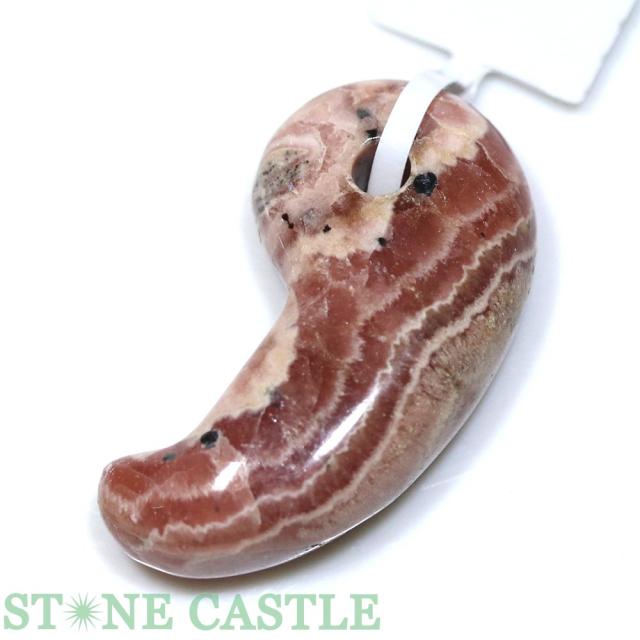 ペルー産らしい深みのある深紅の薔薇のような赤さと、インカローズの形成の特徴を垣間見る事が出来る美しい縞模様。硬度の低い柔らかい石にも関わらず、勾玉の形成も非常に丁寧です!