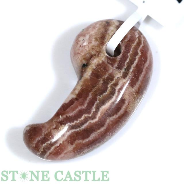 ペルー産らしい深みのある深紅の薔薇のような赤さと、インカローズの形成の特徴を垣間見る事が出来る美しい縞模様。硬度の低い柔らかい石にも関わらず、勾玉の形成も非常に丁寧です!